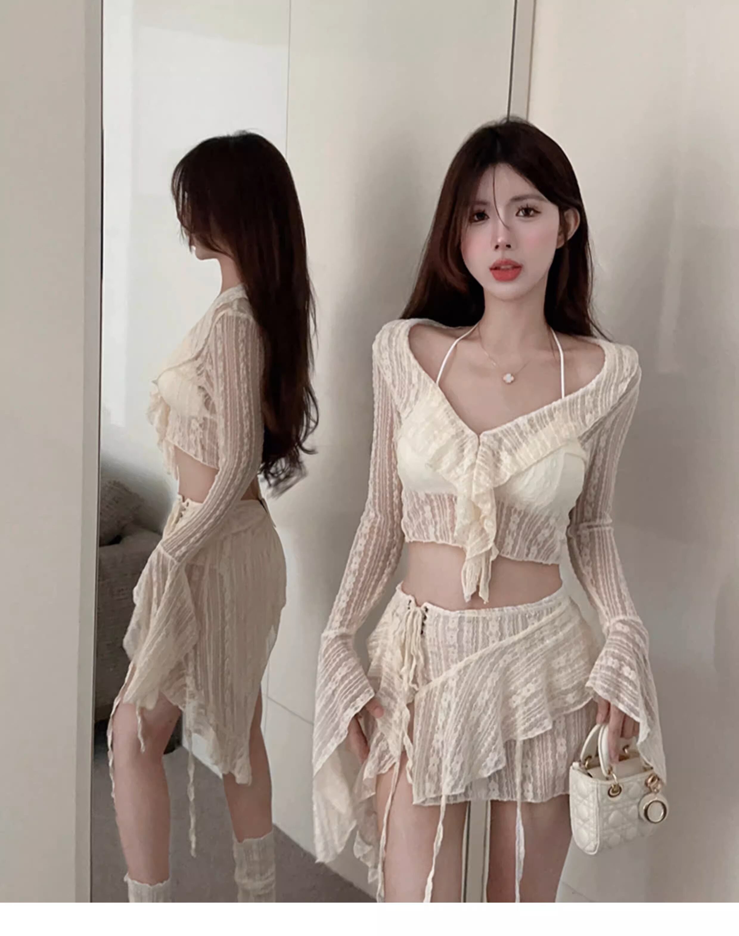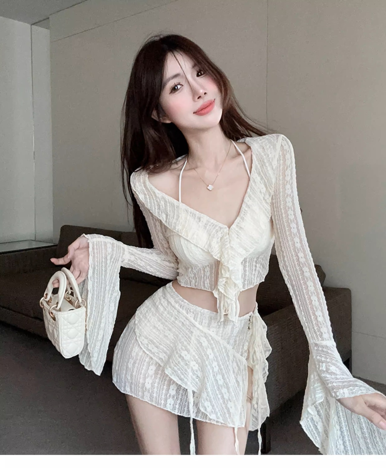 水着 セットアップ カーディガン 羽織り スカート ミニスカート 4点セット 白 ホワイト オフホワイト アイボリー 透け感 シアー レース メッシュ 透かし編み フリル 長袖 クロップド丈 ミニ丈 ショート丈 レースアップ リボン Vネック 夏 春 リゾート ビーチ プール 海 旅行 お出かけ デート かわいい 大人可愛い フェミニン きれいめ カジュアル 体型カバー セット コーデ 20代 30代 韓国ファッション