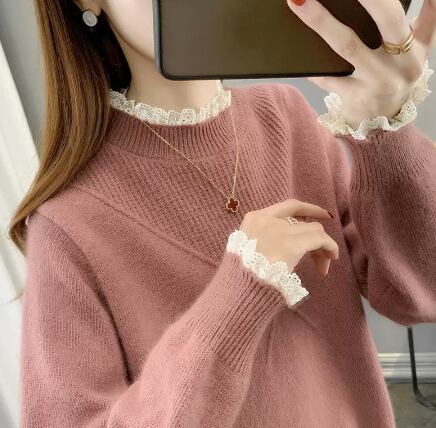 襟と袖裾のフリルレースがかわいい長そでニットです。