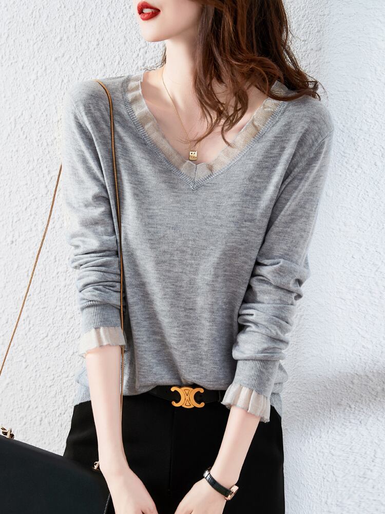 Vネックトップス フリルニットセーター フリルステッチ 長袖ニットセーター カジュアルニットセーター トップス セーター プルオーバー 袖あり 長袖 萌袖 Vネック スリム 細身 Iライン スマート レース シフォン フリル ニット かわいい 大人可愛い きれいめ シンプル カジュアル 大人 上品 おしゃれ お洒落 大人可愛い 大人女子 こなれ感 ラフ ガーリー クール エレガント 主役級 存在感 無地 春 秋 20代 30代 40代 50代 レディース