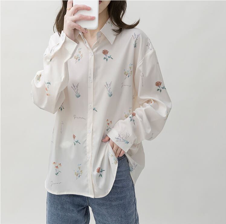 淡いホワイトに水彩画調のお花が品を出すシフォンシャツ