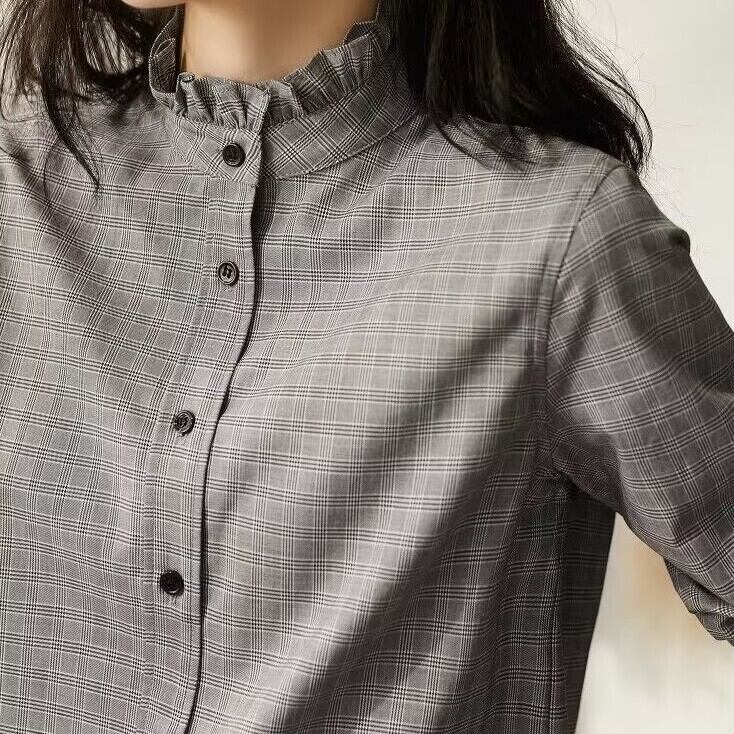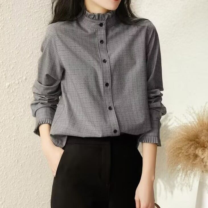 格子柄 大人可愛い ブラウス トップス 長袖 襟なし スタンドカラー フリル かわいい 大人可愛い きれいめ 上品 おしゃれ お洒落 かっこいい 大人女子 こなれ感 クール モード系 モダン フォーマル 柄 チェック柄 春 秋 冬 入学式 入園式 卒業式 卒園式 20代 30代 40代 50代 レディース 女性用 ビジネス デート お出かけ パーティー 着回し 韓国系 オルチャン コーデ トレンド M L XL 2XL ホワイト ブラック モノトーン