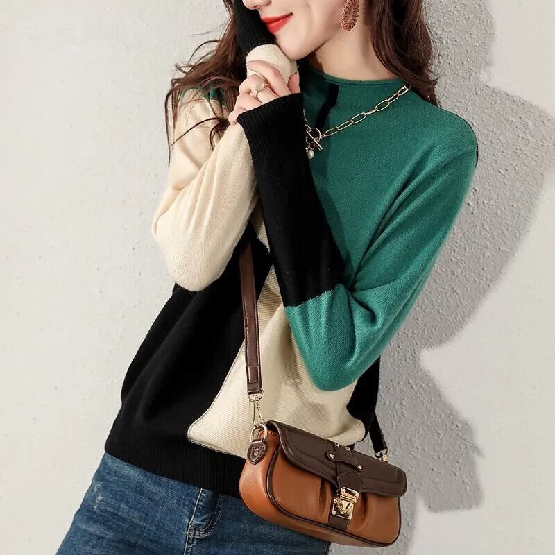 配色ニット トップス おしゃれ上級ニット 大人カジュアル トレンドカラーニット ニットソー セーター 長袖 ラウンドネック 襟なし ウール かわいい 大人可愛い きれいめ クール カジュアル 上品 おしゃれ 大人可愛い こなれ感 春 秋 冬 20代 30代 40代 レディース 女子 学生 通学 普段使い 女子会 M L XL 2XL ブラック グリーン バイカラー オフホワイト モスグリーン 韓国系 オルチャン コーデ トレンド 着回し ニュアンスカラー ファッション コーデ スタイル 楽ちん