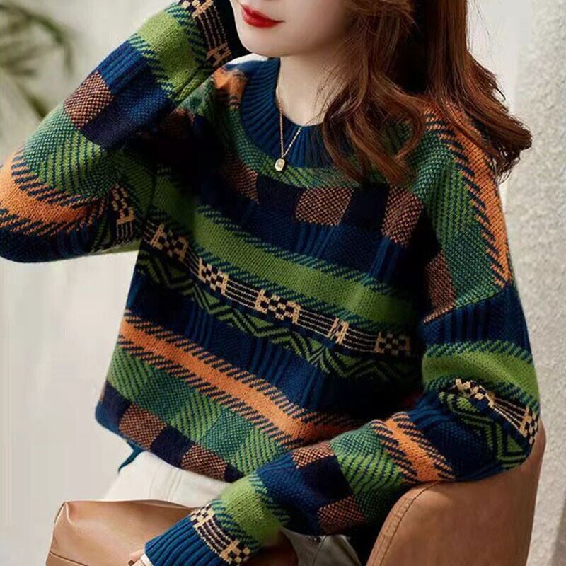 長袖ニット カジュアルニットセーター 幾何学模様トップス ゆったりニットセーター トップス セーター プルオーバー 袖あり 長袖 Uネック ラウンドネック ワイド Iライン スマート ふわふわ ニット かわいい 大人可愛い きれいめ シンプル カジュアル 大人 上品 おしゃれ お洒落 レトロ 大人可愛い 大人女子 こなれ感 ラフ ボーイッシュ 個性的 モード系 エレガント 主役級 存在感 柄 冬 20代 30代 40代 50代 レディース 女性用 ママ