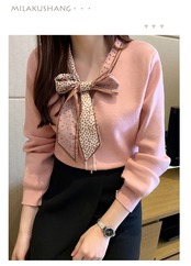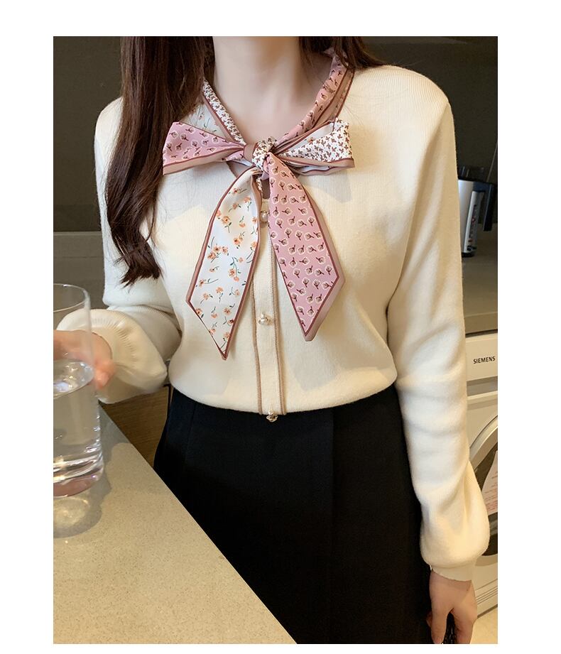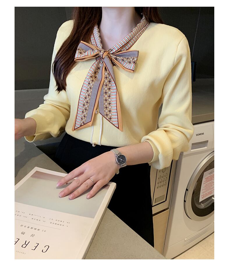 スカーフ風の胸元のリボンのデザインがとってもお洒落なレディースセーターです。
