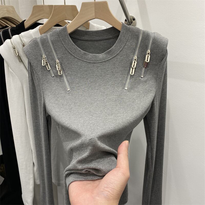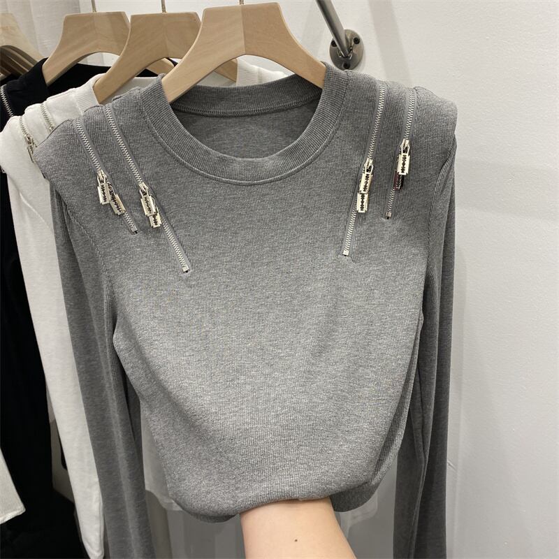 トップス Tシャツ シャツ 白シャツ 白トップス 袖あり ラウンドネック 襟なし ストレート ファスナー カジュアル おしゃれ お洒落 かっこいい こなれ感 個性的 クール モード系 存在感 春 秋 冬 10代 20代 30代 レディース 女性用 ママ 女の子 通勤 学生 通学 お出かけ 女子会 お泊まり 休日 ジム 旅行 着回し 普段使い ファッション コーデ 楽ちん 体系カバー 送料無料 M L XL 2XL 色展開 白 ホワイト 灰色 グレー 春カラー 秋カラー カラバリ
