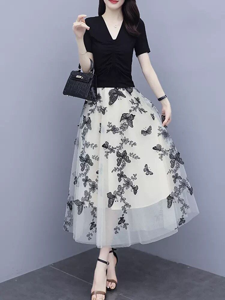 トップス スカート セットアップ Tシャツ カットソー プルオーバー フレアスカート 膝下 ミディアム丈 袖あり 半袖 Vネック 襟なし フレア 透け感 シースルー 上下セット 2点セット ツーピース かわいい 大人可愛い きれいめ シンプル カジュアル 上品 おしゃれ お洒落 キュート ガーリー セクシー 抜け感 無地 春 秋 10代 20代 30代 レディース デート お出かけ 女子会 休日 着回し 重ね着 韓国 モテ 体型カバー S M L XL 2XL