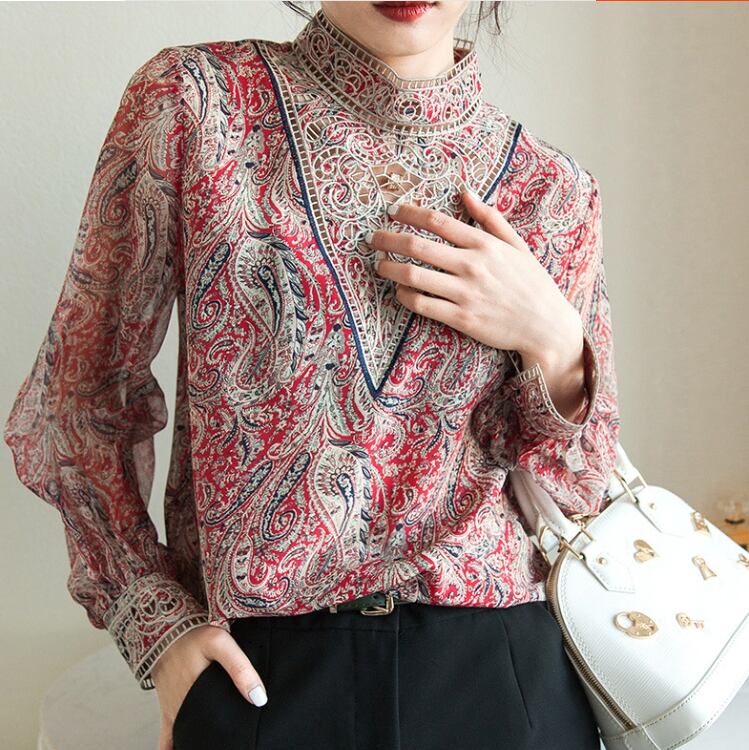 リーフ柄トップス 長袖シフォンシャツ ハイネックシフォンシャツ エレガントカジュアル トップス シャツ ブラウス プルオーバー 袖あり 長袖 Uネック ハイネック スリム ストレート Iライン 切り替えデザイン スマート レース 刺繍 チュール シフォン 切り替えデザイン 編み込み 透け感 シースルー かわいい 大人可愛い きれいめ シンプル カジュアル 大人 上品 おしゃれ お洒落 レトロ アジアン エスニック 大人可愛い 大人女子 こなれ感 個性的 クール セクシー