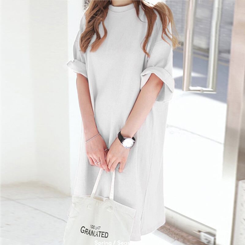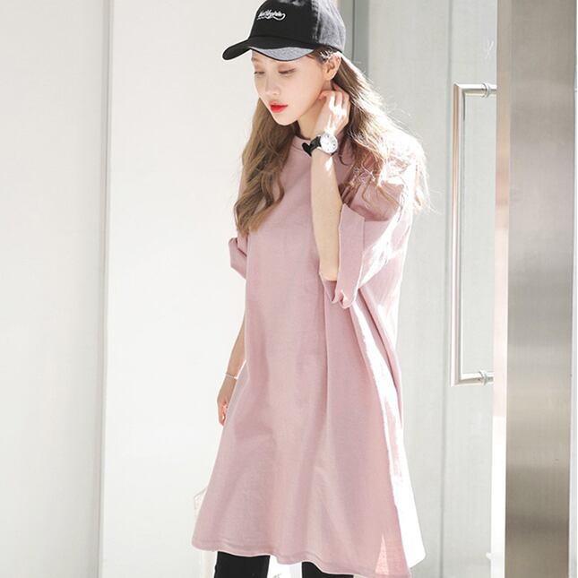 カジュアル Tシャツワンピース 5部袖 ワンピ オーバーサイズ 膝下 ロング ロング丈 袖あり 半袖 5分袖 五分袖 ラウンドネック ゆったりサイズ ラフ スマート 体型カバー かわいい 大人可愛い きれいめ シンプル カジュアル 大人 上品 おしゃれ M L XL 2XL ピンク ホワイト ブラック パープル レッド ディープパープル お洒落 大人可愛い 大人女子 こなれ感 ガーリー クール モード系 主役級 存在感 無地 春 夏 重ね着 20代 30代 40代 50代 女性用 ママ マタニティ