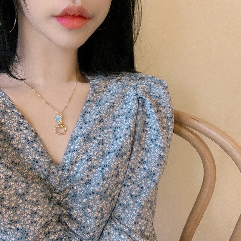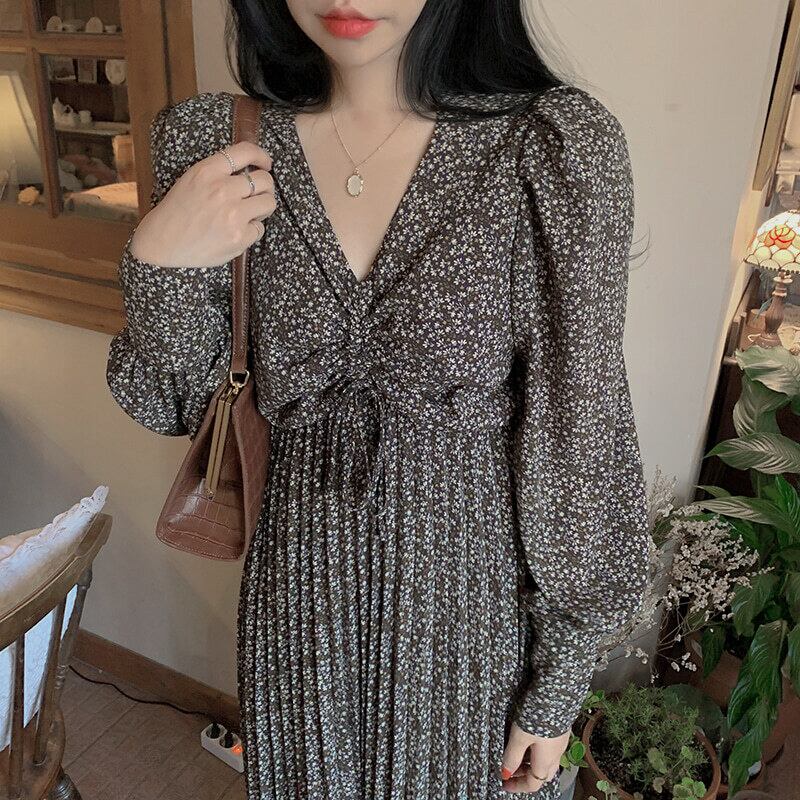 ワンピース ワンピドレス 長袖 袖あり Vネック カシュクール 小花柄 フラワー 花柄 ハイウエスト プリーツスカート 切り替え ロング ひざ下 シンプル 二の腕カバー かわいい 大人可愛い きれいめ シンプル カジュアル 大人 上品 おしゃれ 10代 20代 30代 レディース 女の子 女子 通勤 学生 通学 デート お出かけ 公園デビュー 女子会 ランチ会 お泊まり 休日 着回し 普段使い 着回し 韓国 モテ 定番 トレンド インスタ映え リゾート 旅行 S M L XL ブルー 青 ブラック 黒