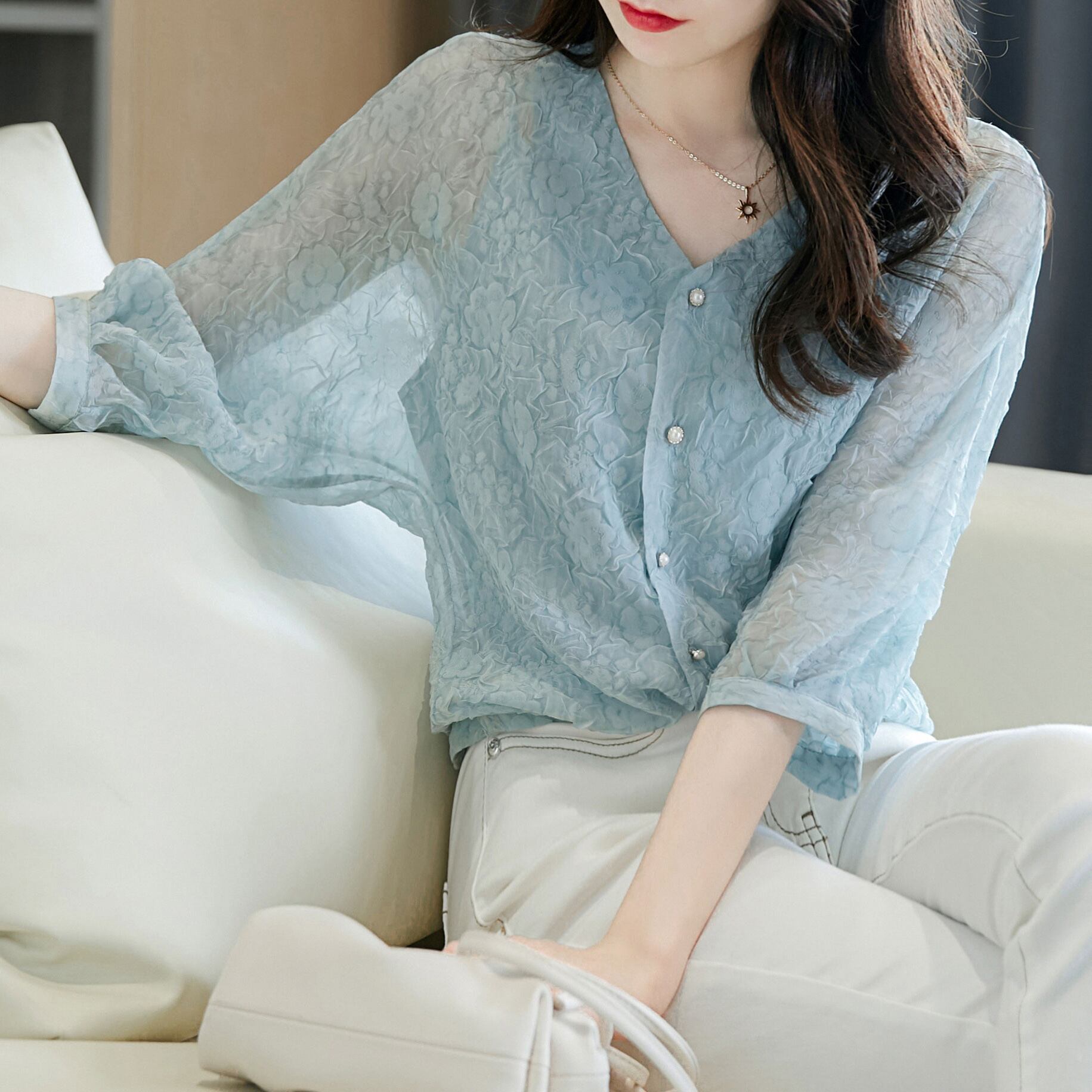 透け感のあるブルーが涼し気で上品なシフォンシャツ