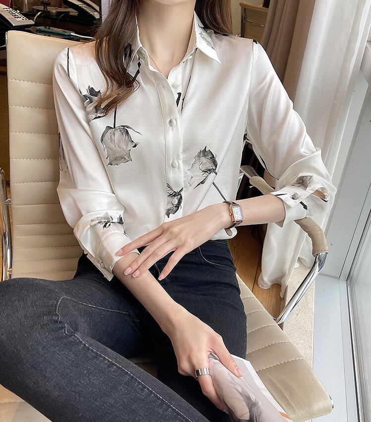 モノトーンなボタニカル柄が上品なシフォンシャツ