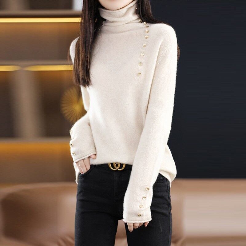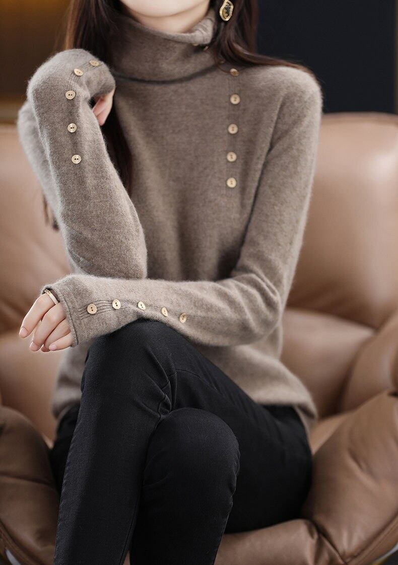 首元から飾りボタンがアクセントになったデザイン性の高いニット。