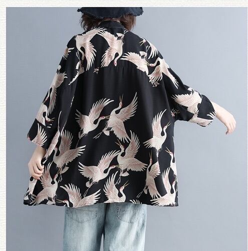 鶴柄 シャツ トップス 7分袖 ワイド かわいい 大人可愛い きれいめ シンプル カジュアル 大人 おしゃれ お洒落 かっこいい アジアン 大人可愛い 大人女子 こなれ感 ラフ メンズライク ボーイッシュ ルーズ 個性的 クール 抜け感 柄 春 夏 秋 20代 30代 40代 50代 60代 レディース 女性用 ママ 女の子 学生 デート お出かけ 女子会 お泊まり 休日 アウトドア イベント リゾート 旅行 海 プール 高原 ショッピング 着回し 普段使い 重ね着 ファッション コーデ