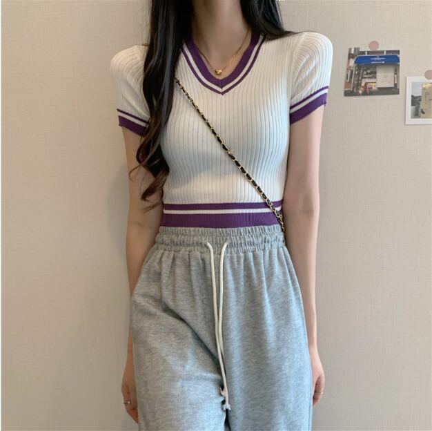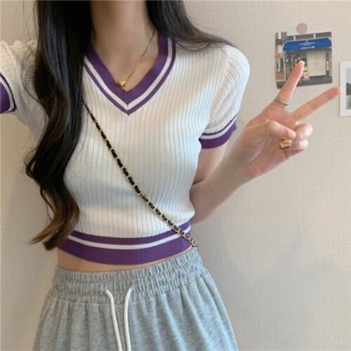 トップス Tシャツ カットソー ニットソー ミニ丈 ショート 半袖 Vネック スリム タイト 細身 ハイウエスト 脚長 伸縮性 サマーニット かわいい 大人可愛い きれいめ おしゃれ お洒落 大人可愛い 大人女子 こなれ感 カジュアル キュート ガーリー スポーティー セクシー 主役級 存在感 10代 20代 30代 春 夏 OL 学生 通学 デート お出かけ 女子会 お泊まり ジム イベント リゾート 旅行 海 ホテル ガーデン 着回し スタイル モテ インスタ映え 色展開 ホワイト ブラック パープル
