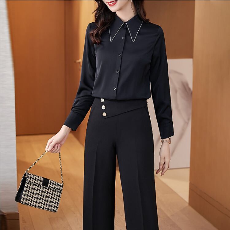 フォーマル2点セット セットアップコーデ ブラックコーディネート 上下ツーピース トップス ボトムス パンツ Tシャツ シャツ カットソー ワイドパンツ ストレートパンツ ロング ロング丈 袖あり 長袖 Vネック 襟付き スリム 細身 ストレート Iライン スマート シフォン ハイウエスト 上下セット 2点セット ツーピース かわいい 大人可愛い きれいめ シンプル カジュアル 大人 上品 おしゃれ お洒落 かっこいい 大人可愛い 大人女子 こなれ感 クール モード系