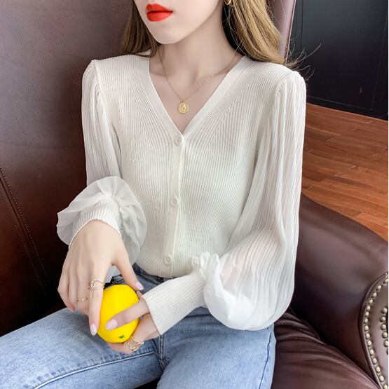 ボリューム袖ニット シフォンボリューム袖 異素材ミックス リブニットトップス トップス ブラウス ニットソー セーター 白シャツ 白トップス 袖あり 長袖 ボリューム袖 パフスリーブ Vネック スリム ストレート Iライン スマート シフォン 前開き リブニット ニット かわいい 大人可愛い きれいめ シンプル カジュアル 大人 上品 おしゃれ お洒落 大人可愛い 大人女子 こなれ感 ラブリー キュート 個性的 クール モード系 エレガント モダン 主役級 存在感 春