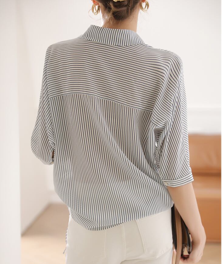 ストライプシャツ 七分袖シフォンシャツ 夏長袖シャツ カジュアルシャツ トップス Tシャツ シャツ ブラウス 袖あり 7分袖 七分袖 長袖 Vネック 襟付き スリム 細身 ストレート Iライン スマート シフォン リボン かわいい 大人可愛い きれいめ シンプル カジュアル 大人 上品 おしゃれ お洒落 大人可愛い 大人女子 こなれ感 ラブリー キュート ガーリー 個性的 クール モード系 エレガント モダン 主役級 存在感 ボーダー ストライプ 春 夏 20代
