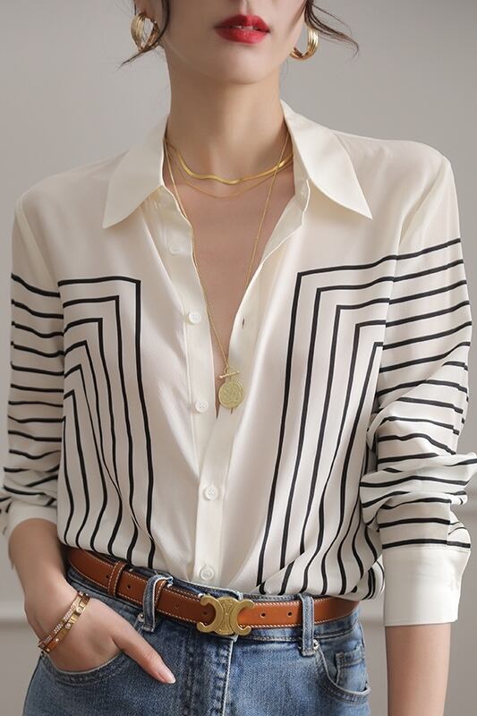 ラインデザイントップス 春秋長袖トップス プリントシャツ カジュアル長袖シャツ トップス シャツ ブラウス 白シャツ 白トップス 袖あり 長袖 Vネック 襟付き スリム 細身 ストレート Iライン スマート シフォン かわいい 大人可愛い きれいめ シンプル カジュアル 大人 上品 おしゃれ お洒落 大人可愛い 大人女子 こなれ感 ガーリー 個性的 クール モード系 エレガント モダン 主役級 存在感 ボーダー ストライプ 春 秋 20代 30代