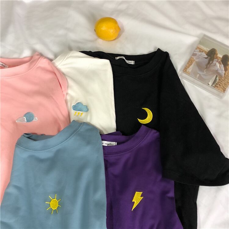 お天気マーク刺繍 カジュアルシャツ カジュアルカラーシャツ 半袖トップス 刺繍入りトップス トップス Tシャツ シャツ プルオーバー 白シャツ 白トップス 袖あり 半袖 5分袖 五分袖 Uネック ラウンドネック スリム ストレート Iライン スマート 刺繍 かわいい 大人可愛い きれいめ シンプル カジュアル 大人 上品 おしゃれ お洒落 かっこいい 大人可愛い 大人女子 こなれ感 ラフ ボーイッシュ キュート ガーリー ルーズ 個性的 クール モード系 エレガント モダン 主役級 存在感 春 夏 秋