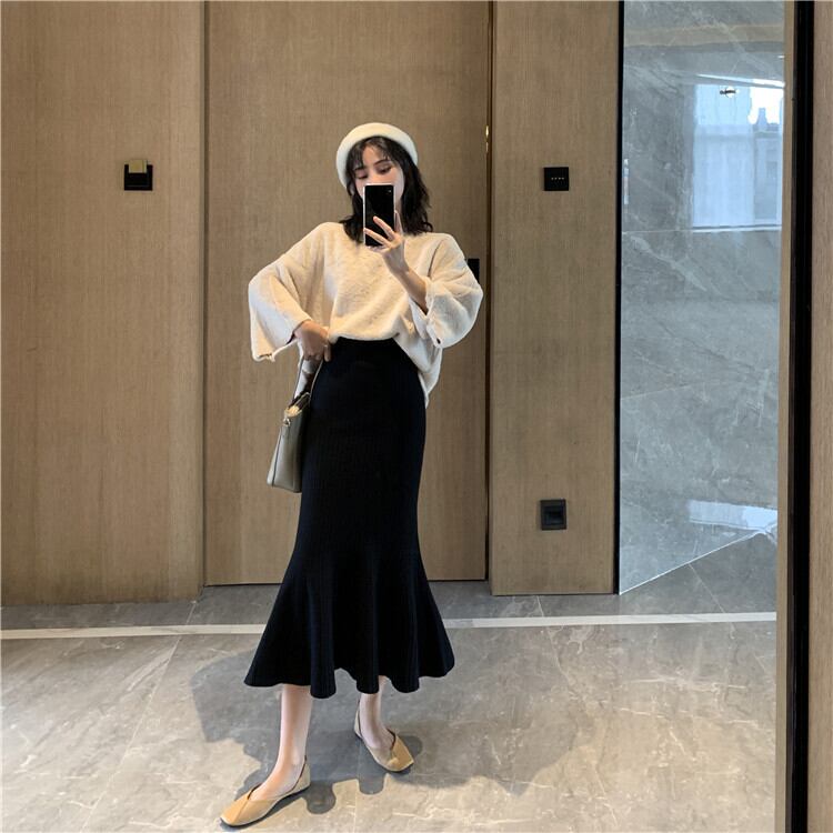 マーメイド ニット ロングスカート ミモレ丈 膝下 ハイウエスト 裾フレア タイト スリム 細身 伸縮性 ウエストゴム 楽ちん リブ ストレッチ かわいい 大人可愛い トレンド 流行 シンプル カジュアル スタイルアップ おしゃれ お洒落 大人可愛い 大人女子 こなれ感 ラフ ガーリー 無地 春 秋 冬 10代 20代 30代 40代 50代 レディース 女性用 デート お出かけ ショッピング 映え 女子会 休日 着回し 普段使い 韓国 韓国系 モテ 美脚 脚長 定番 モテ ベージュ 黒 ブラック 無地