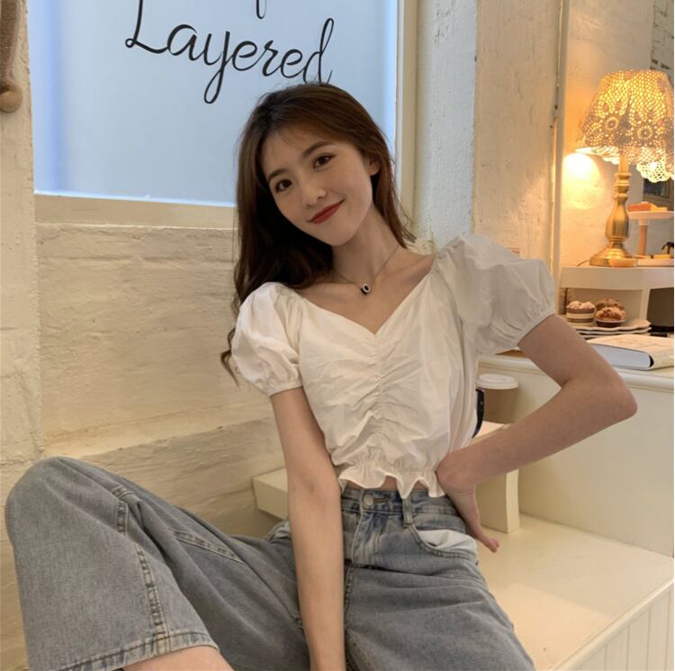 ショート丈トップス パフスリーブショート丈シャツ フリルデザイントップス ミニ丈ショートトップス トップス Tシャツ シャツ カットソー プルオーバー 白シャツ 白トップス ミニ ミニ丈 ショート ショート丈 袖あり 半袖 5分袖 五分袖 ボリューム袖 パフスリーブ Vネック スリム タイト ストレート Iライン スマート フリル ハイウエスト かわいい 大人可愛い きれいめ シンプル カジュアル 大人 上品 おしゃれ お洒落 大人可愛い 大人女子 こなれ感 ラフ ラブリー キュート ガーリー 個性的