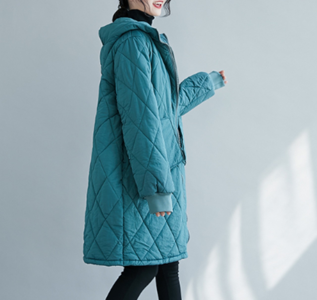 フード付きで、秋冬の季節にも大活躍。個性的なキルティング柄がトレンド感を演出し、無地デザインでシンプルで上品な印象を与えます。ファスナーやポケットもついていますから、実用性に優れているのもポイントの一つ。