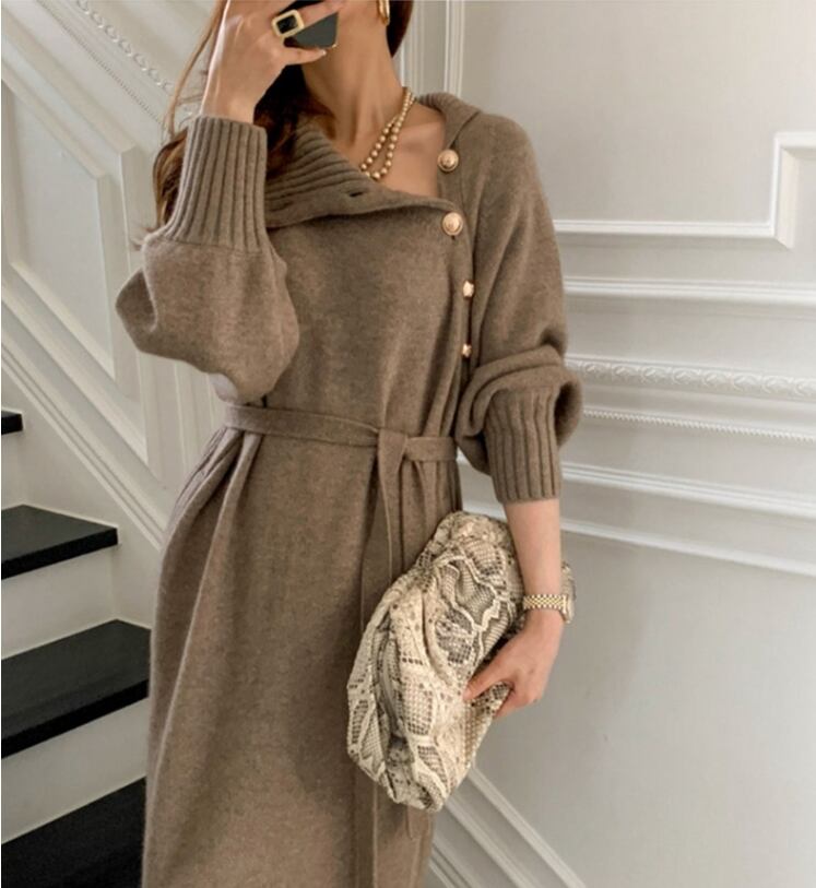 ハイネックニットワンピースで、エレガントカジュアルに。すっきりとしたIラインシルエットで、大人っぽく上品に着こなせる一枚です。ハイネックが顔周りをすっきりと見せてくれるので、小顔効果も抜群です。お出かけやデートにぴったりの、上品なワンピースです。