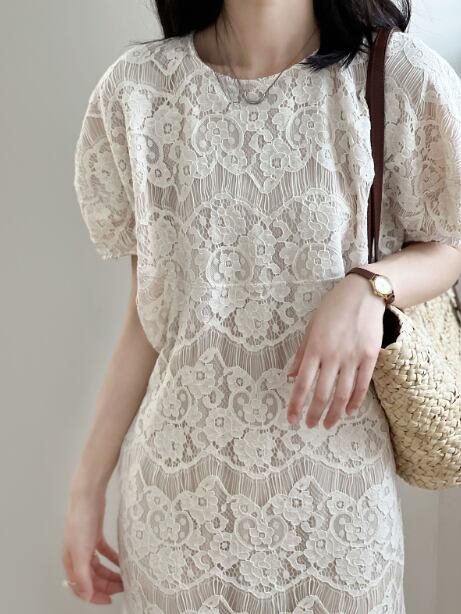 ワンピース モテアイテム 大人可愛い ミディアム丈 ドルマンスリーブ パフスリーブ ラウンドネック 細身 Iライン スマート レース 刺繍 透け感 シースルー 通気性 薄手 かわいい 大人可愛い きれいめ 大人 上品 おしゃれ お洒落 レトロ 大人女子 ラブリー キュート ガーリー モダン 存在感 春 夏 秋 10代 20代 30代 40代 学生 デート お出かけ 公園デビュー 女子会 お泊まり 休日 パーティー イベント ホテル レストラン 韓国 韓国系 オルチャン コーデ スタイル モテ 美脚 脚長