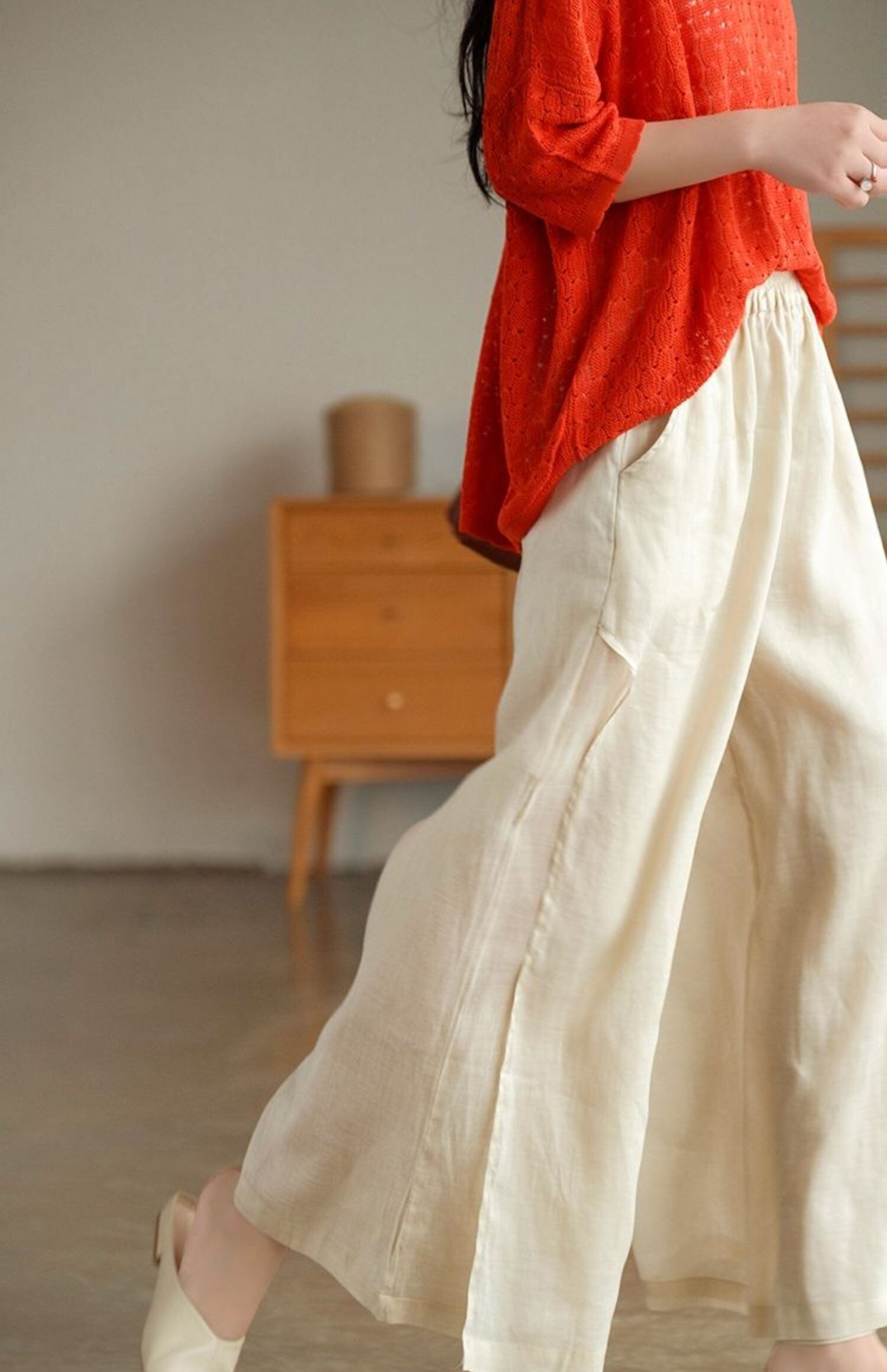 このパンツは、リネンの優しい肌触りとドレープが魅力です。ウエストゴム仕様で楽ちんに着こなせ、カジュアルシーンにぴったりです。膝下丈で、スタイルアップ効果も抜群です。ぜひこのパンツで、おしゃれなカジュアルコーデを楽しんでみてください。