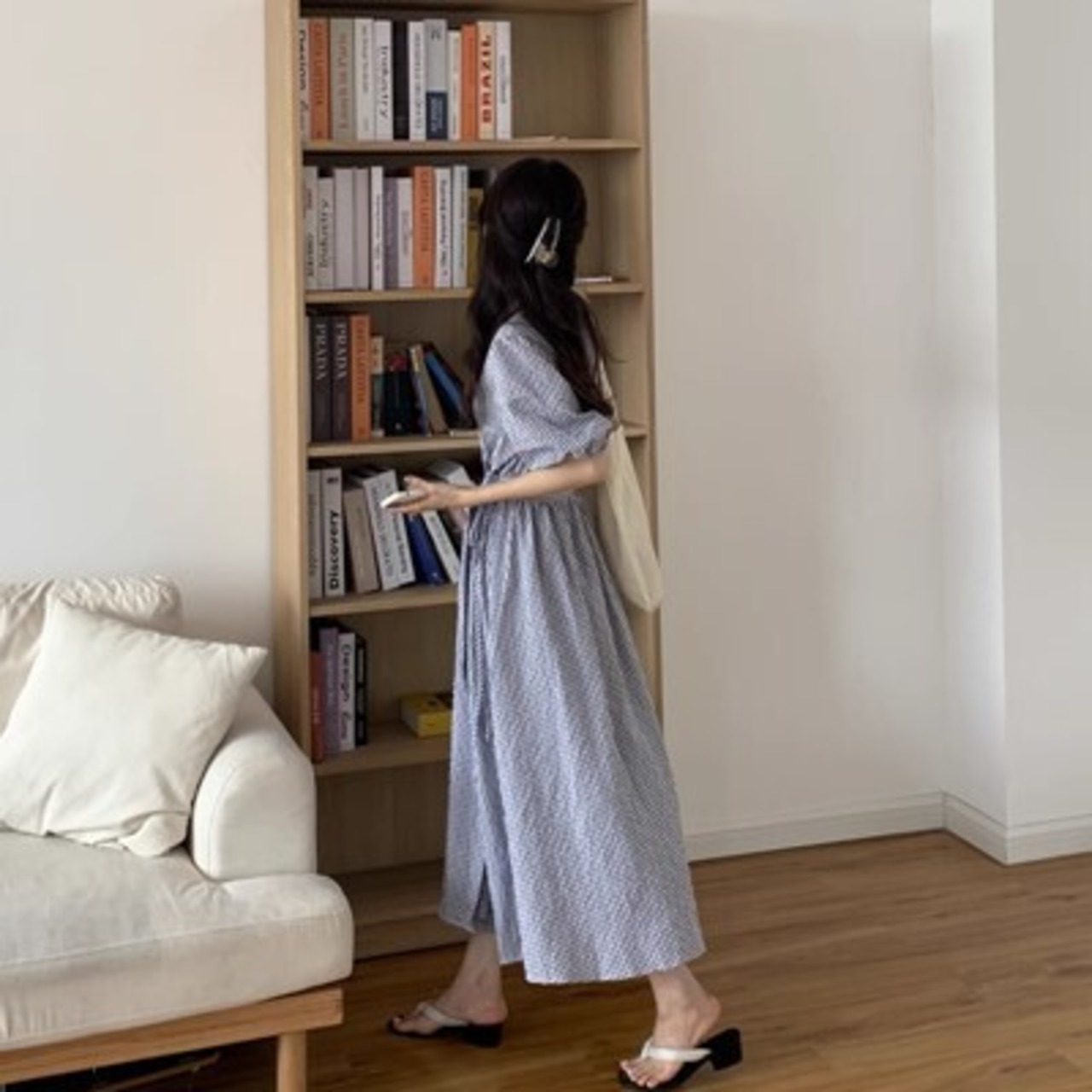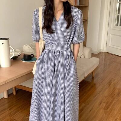 ワンピース フレアワンピース ロング丈 袖あり 五分袖 Vネック 襟なし フレア Aライン かわいい 大人可愛い きれいめ シンプル カジュアル 大人 上品 おしゃれ かっこいい 大人可愛い 大人女子 こなれ感 ラブリー キュート モダン 柄 チェック柄 春 秋 10代 20代 30代 レディース 女性用 デート お出かけ 女子会 休日 着回し 普段使い 韓国系 コーデ スタイル フリーサイズ ブルー