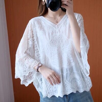 トップス ブラウス 袖あり 長袖 Vネック 襟なし 刺繍 透け感 かわいい 大人可愛い きれいめ シンプル カジュアル 大人 上品 おしゃれ かっこいい 大人可愛い 大人女子 こなれ感 ラブリー キュート モダン 柄 チェック柄 春 秋 10代 20代 30代 レディース 女性用 デート お出かけ 女子会 休日 着回し 普段使い 韓国系 コーデ スタイル フリーサイズ ホワイト ブルー ピンク