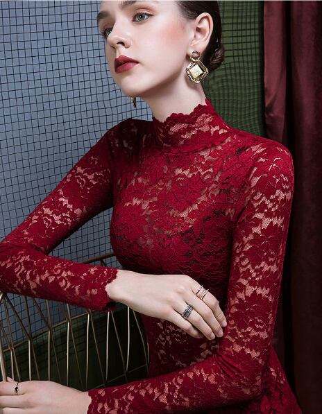 レース素材のミドルネックトップス。インナーとしても使えるアイテム。